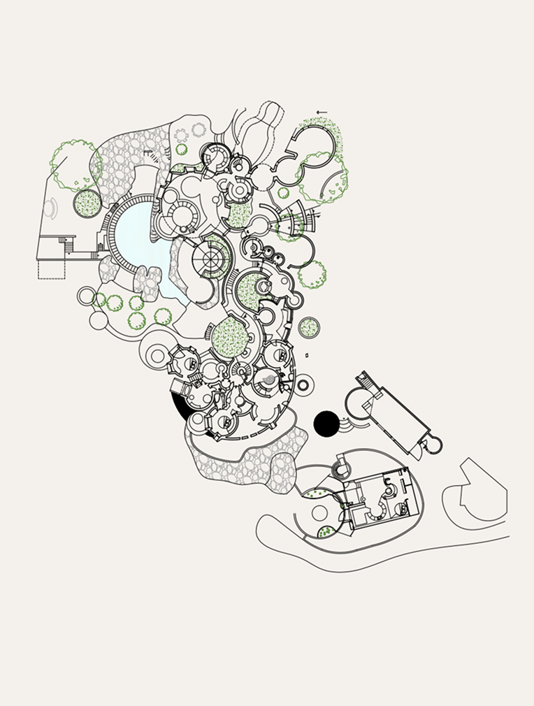 Conçue dans les années 1970, elle inaugure une architecture organique composée de volumes sphériques et de formes courbes, inspirée par la nature et par le mouvement du corps humain.
